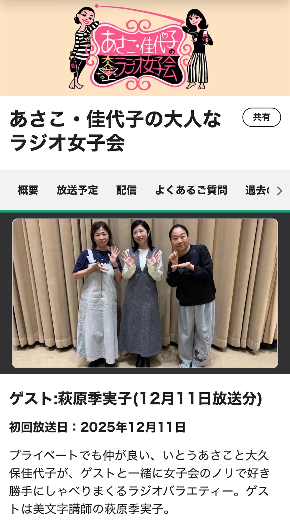 番組名:NHKラジオ第1「あさこ・佳代子の大人なラジオ女子会」